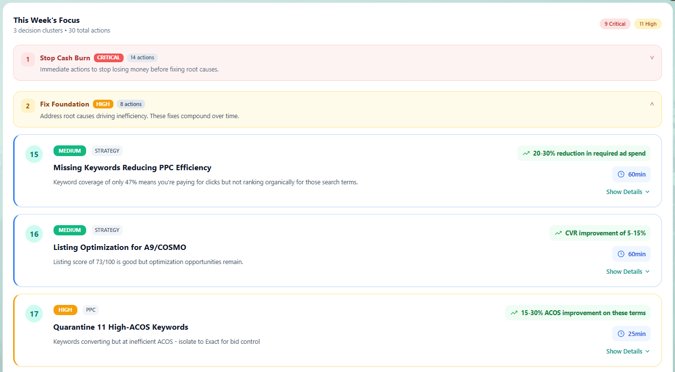 Forrest connects PPC, listing quality, and inventory to show what's actually blocking your profitability — and what to fix first.
