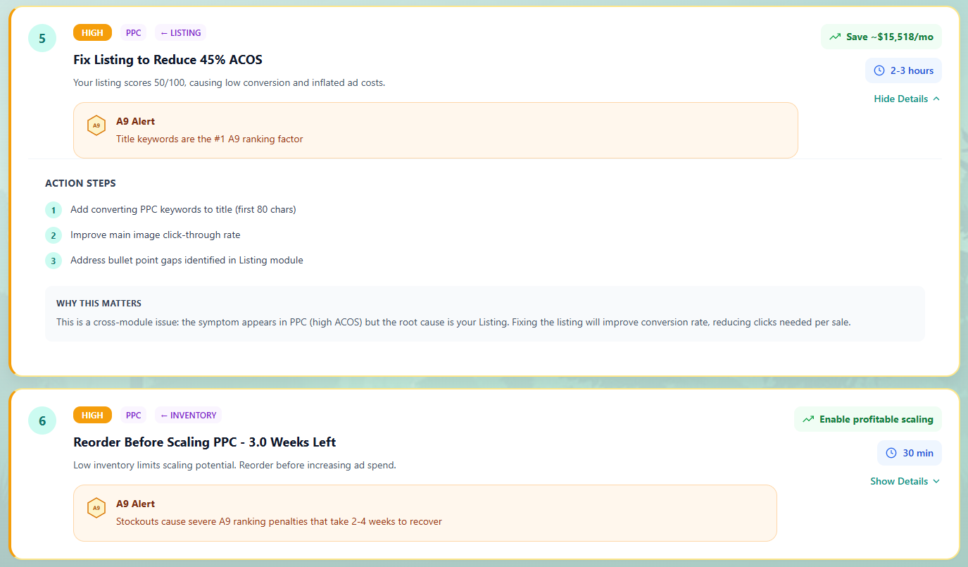 PPC, listings, and inventory are analysed separately - even though they impact each other.